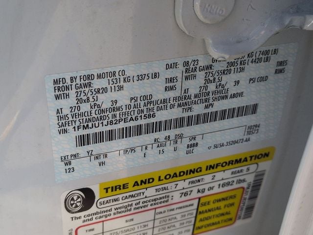 Certified. Oxford White 2023 Ford Expedition XLT 110V/150W AC Power Outlet, 2nd Row Power-Folding Captain's Chairs, 3rd Row Vinyl Head Restraints, 4-Door Intelligent Access (Lock/Unlock), Accent Color Painted Rear Bumper, ActiveX-Trimmed 1st & 2nd Row Seats, Advanced Security Pack, Ambient Lighting, Bright Chrome Plated Accent Platform Running Boards, Equipment Group 202A High Package, Heated Steering Wheel, Heated/Ventilated Front Seats, Intersection Assist, LED Fog Lamps w/Black Painted Bezel, LED Reflector Headlamps, Panoramic Vista Roof, Power Liftgate, Power Tilt/Telescopic Steering Wheel w/Memory, Power-Adjustable Pedals w/Memory, Power-Folding Sideview Mirrors w/Autofold, Remote Start, SecuriCode Keyless Entry Pad, Sideview Mirrors w/Turn Signal Indicators, Special Edition Package, Vinyl Center Console, Wheels: 20 Bright Machined Aluminum, Wireless Charging Pad.